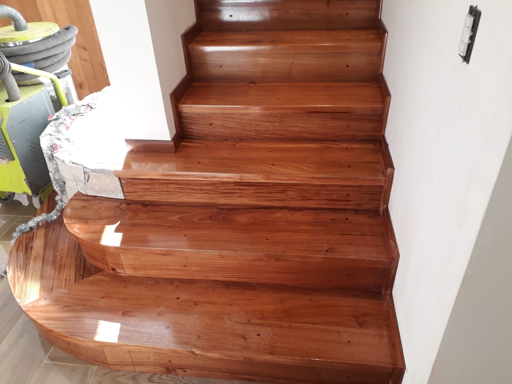 Escalones macizos con contrahuellas de la misma madera, y en su comienzo se ensancha para subir tanto de frente como si ingresa de costado.