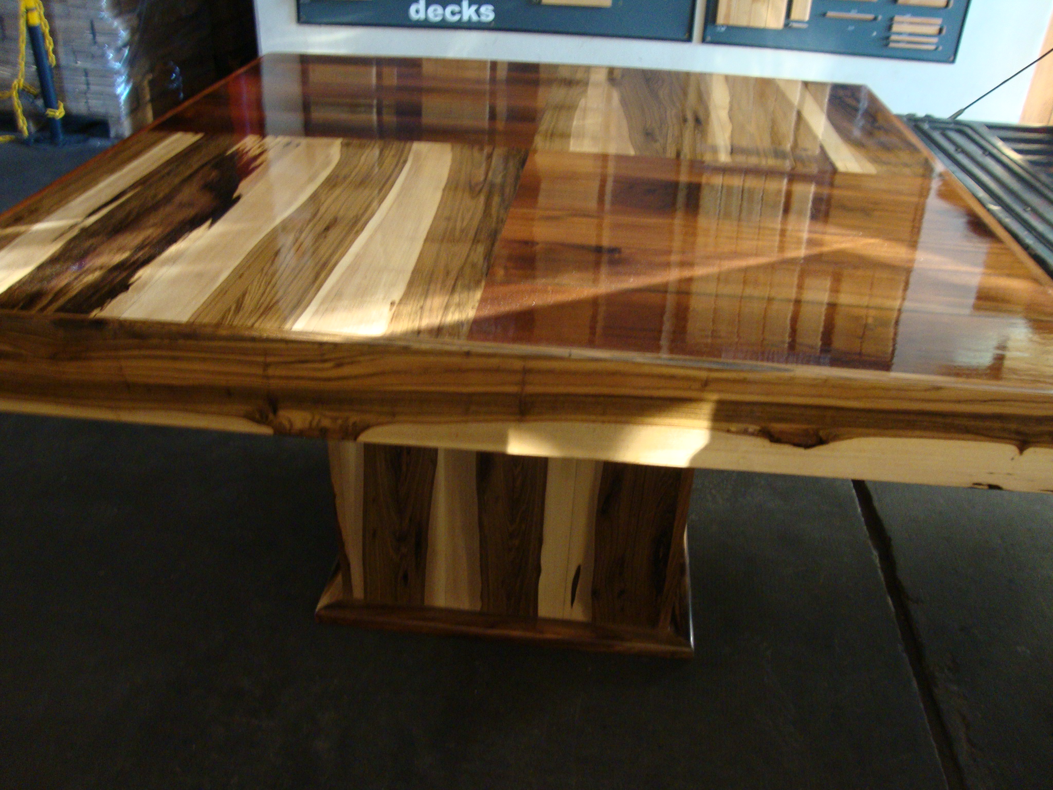 Mesa rectangular formado con 4 cuadrados combinando 2 maderas (guayubira y viraro) con faldon de 8 cm, medida 1,40 X 1,40 y alto 0,78 mts.
