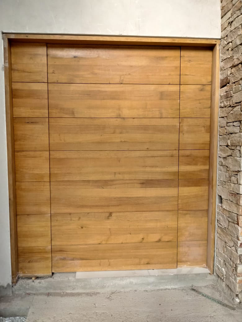 Puerta pivotante hecha con Roble claro que es la parte externa de la vasija vinaria, hoja y paños fijos en espesor de 8 cm, maderas en sentido horizontal con detalle de buñas en la puerta que continúan en los paños fijos, marco cajón de 4X20 cm; Abertura total de 2,00 X 2,20 mts y puerta de 1,60 mts.