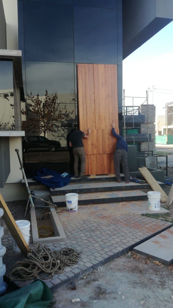 Espectacular puerta (sistema pivotante) de 1,4 ancho X 3,45 mts alto, con estructura metálica interna y revestida con madera de 2 cm en ambas caras y detalle al frente de listones de 2cm en relieve.